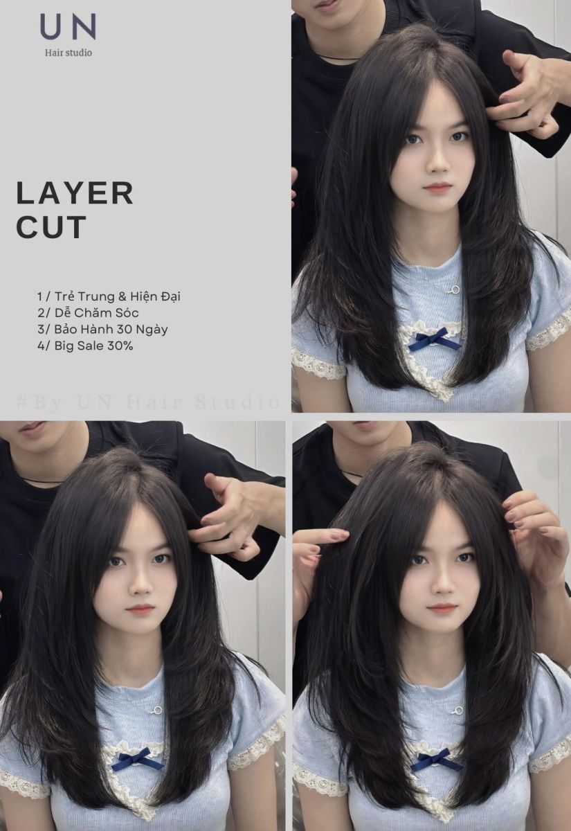 Tóc layer là kiểu tóc được cắt thành nhiều tầng xen kẽ, giúp tạo độ bồng bềnh tự nhiên và ôm gọn khuôn mặt. Đây là kiểu tóc quốc dân được nhiều chị em lựa chọn tại UN Hair Studio Buôn Ma Thuột nhờ khả năng hack mặt nhỏ, tôn da và cực kỳ dễ chăm sóc.